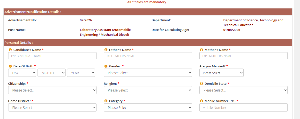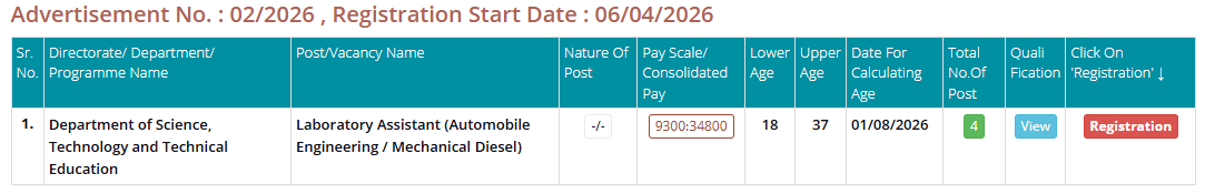 | Post Name | Laboratory Assistant |